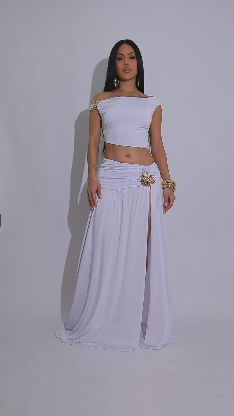 - This statement skirt set is all about graceful movement and luxe detailing, featuring romantic ruching and sculptural gold floral accents. Effortlessly elegant, it’s made to bloom beautifully from evening dinners to upscale celebrations.