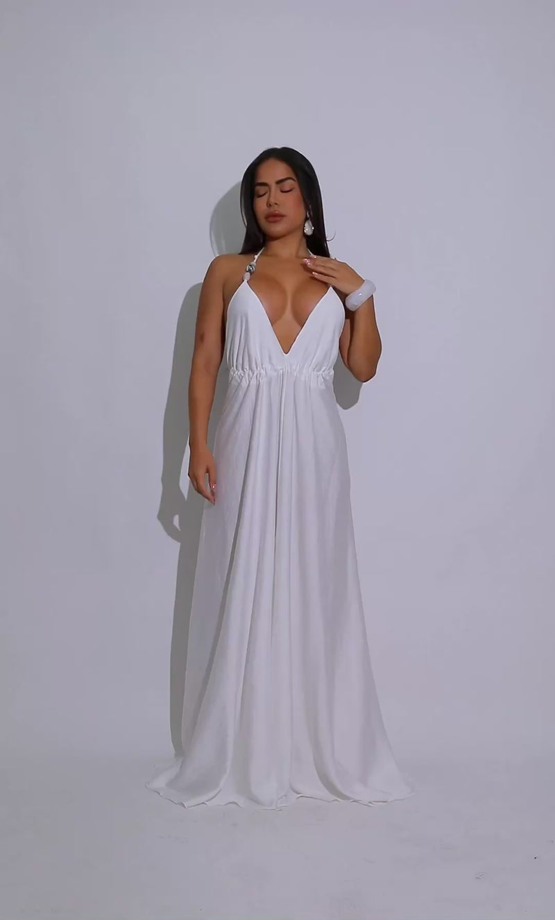 - Minimalist meets flirty in this lightweight maxi dress, designed with subtle cutouts and delicate beaded tie straps. Flowy and feminine, it’s your go-to for sunkissed days and moonlit escapes.