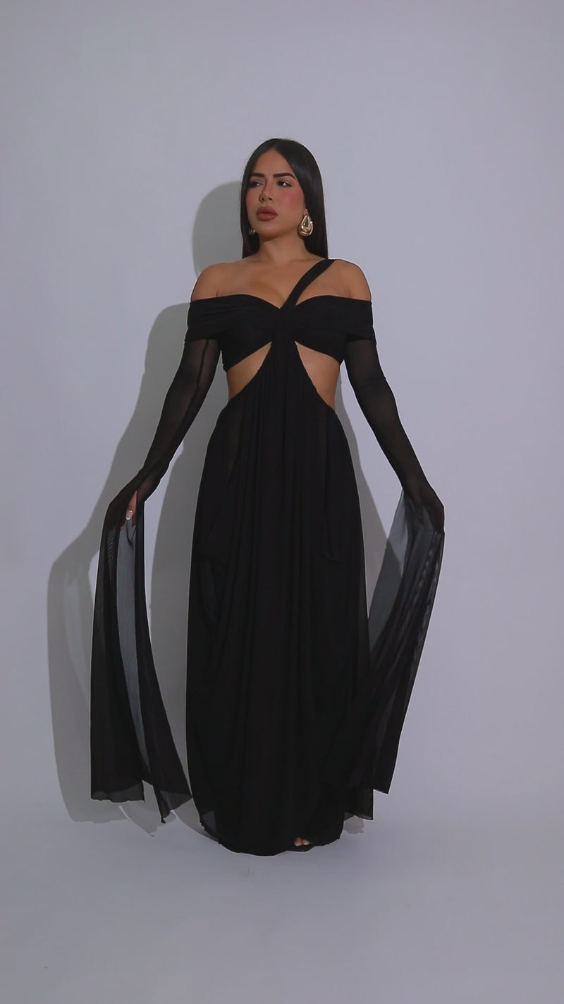 - A vision of modern elegance, this flowing maxi dress features sculptural draping, daring cutouts, and sheer detachable gloves. Designed for the spotlight, it embodies both sensuality and strength in one unforgettable look.