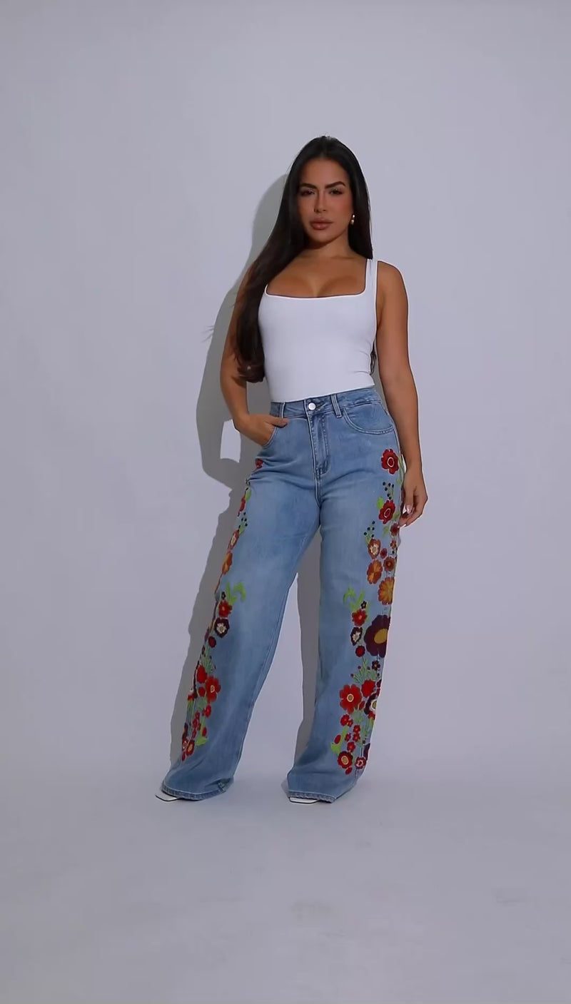 • Let your outfit blossom in these floral wide leg jeans, detailed with whimsical embroidery that trails along each leg. A fresh take on denim that brings a touch of nature-inspired elegance to your everyday look.