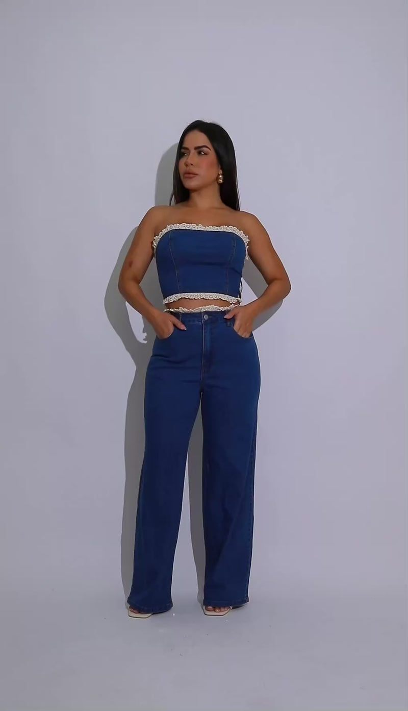 - Sweet meets edgy in this denim pant set featuring delicate lace trim, flirty lace-up details, and a structured crop top to match. Paired with wide-leg jeans, it's the perfect mix of retro romance and bold street style.