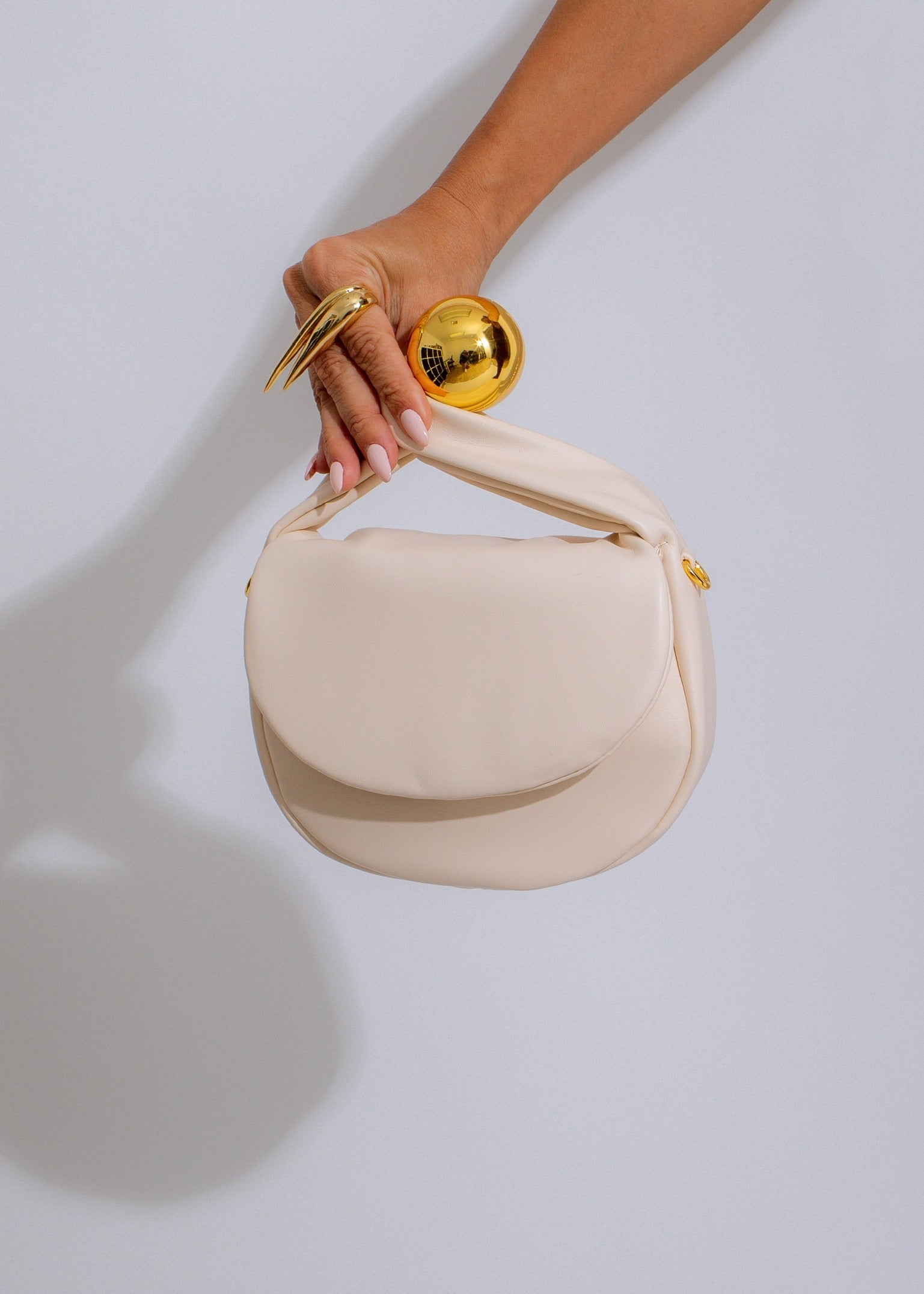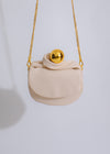 - Elevate your accessory game with the "Orbit Handbag," a statement piece that combines modern minimalism with celestial elegance. This unique bag features a smooth, sculpted form adorned with a striking golden orb, adding a touch of cosmic allure to your ensemble. The soft, structured silhouette is complemented by a sleek gold chain, making it perfect for both day and night.
