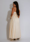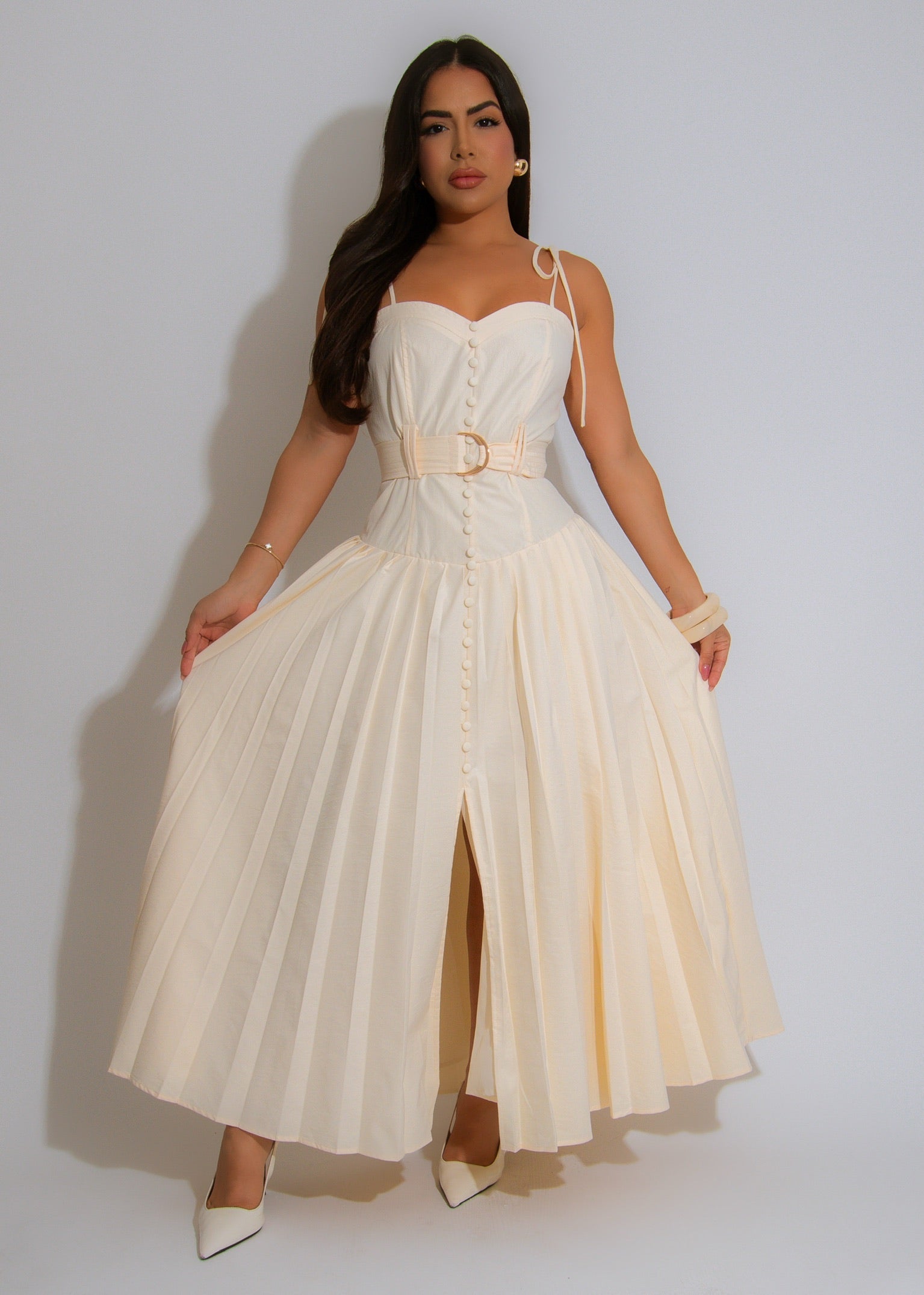 - A perfect blend of vintage charm and modern elegance, this midi dress is designed to captivate. Featuring a structured bodice with delicate button detailing and a flowing pleated skirt, it’s the epitome of effortless sophistication. The adjustable straps and belt accentuate the waist, making it a flattering choice for any occasion, from brunch dates to garden soirées.